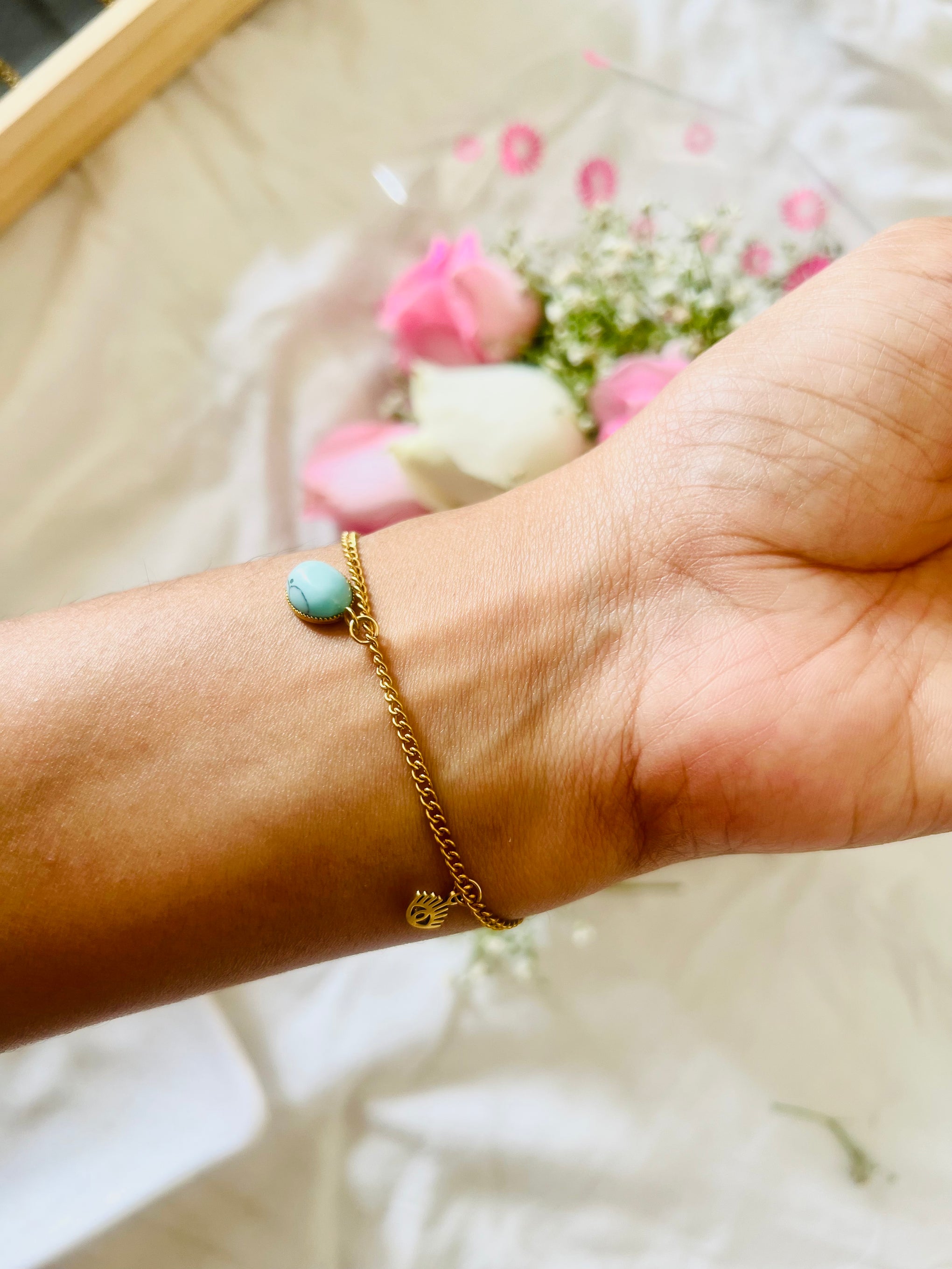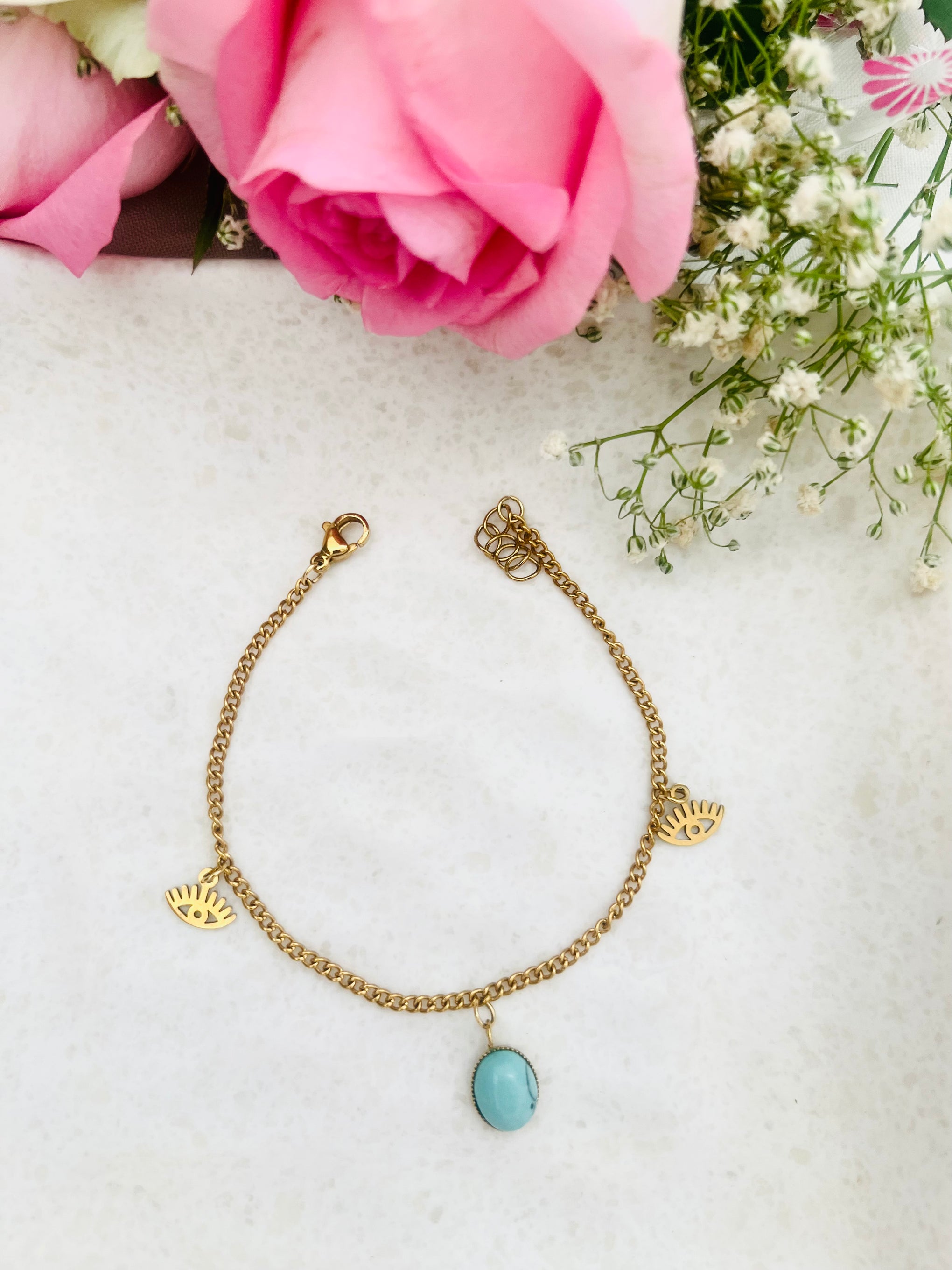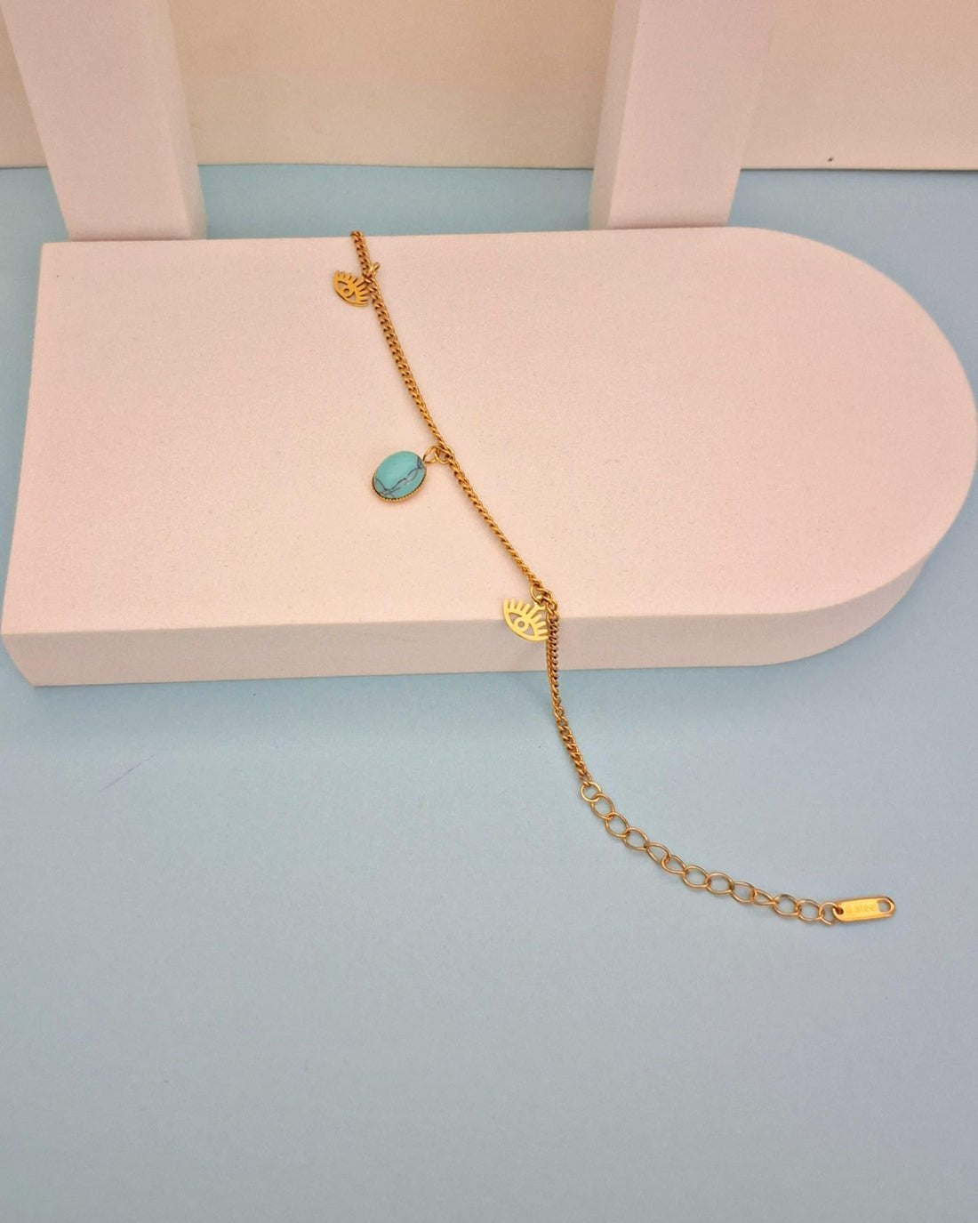 Embrace modern mystique with the Azure Vision Charm Bracelet. This chic gold chain features symbolic eye charms paired with a striking turquoise stone, inviting positive vibes and fresh style to your everyday look. Lightweight, adjustable, and perfect for layering, it’s an effortless accessory for those who love meaningful, distinctive jewelry. Wear your charm, stack your story, and let every glance spark curiosity.