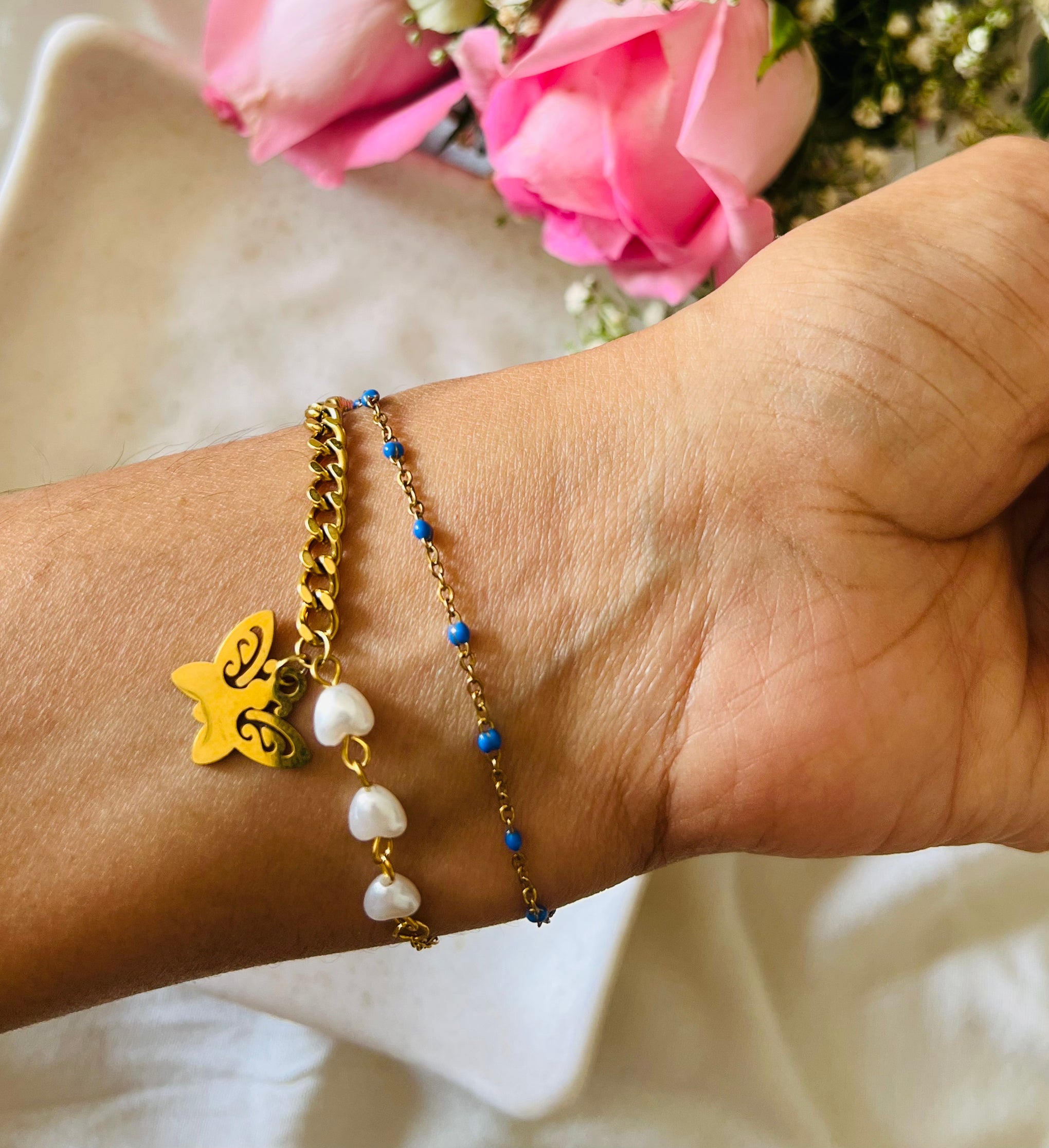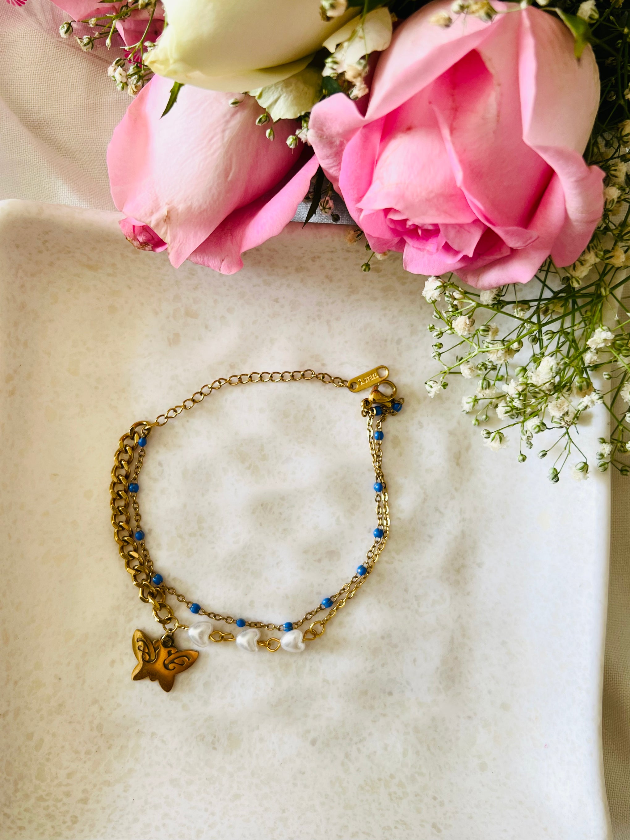 Add instant charm to your style with the Butterfly Bliss Duo Charm Bracelet. This layered bracelet features a striking gold butterfly, dainty heart-shaped pearls, and delicate blue beads—creating a fresh, playful look you’ll love every day. Comfortable, lightweight and easy to stack, it’s the perfect accessory to express your individuality. Elevate your jewelry collection with a touch of whimsy and elegance.