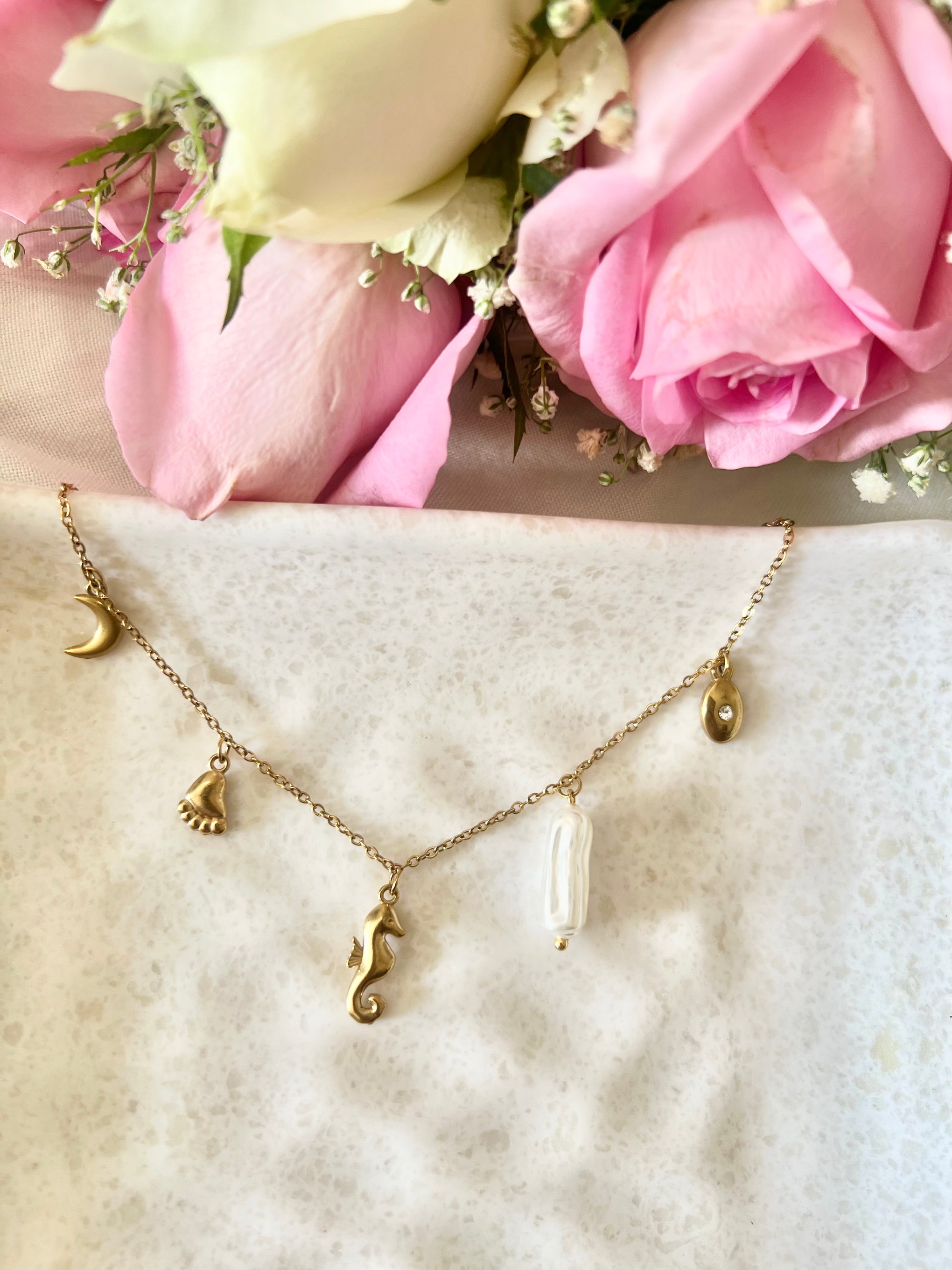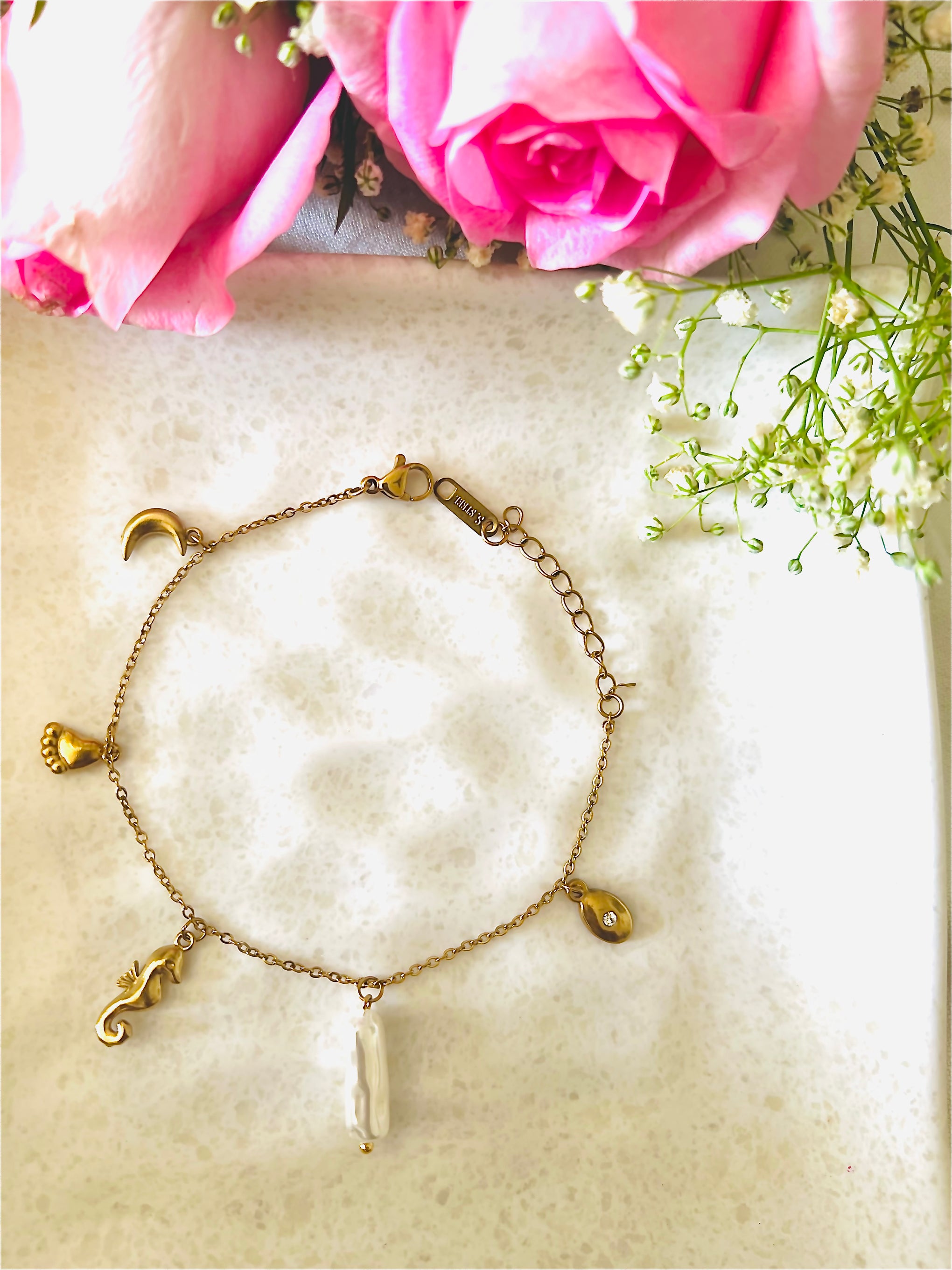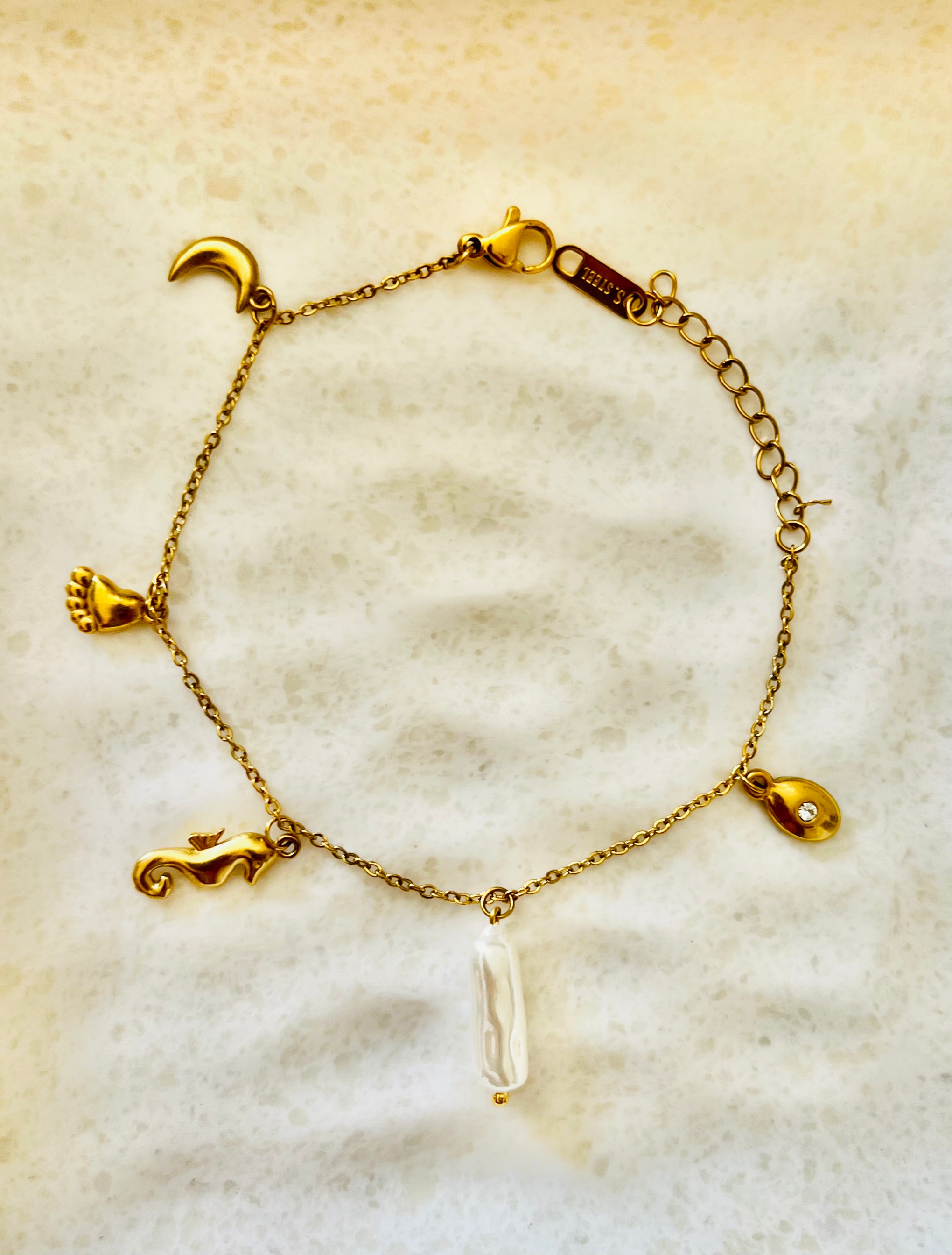 Step into a world of imagination with the Celestial Dream Charm Bracelet. Adorned with enchanting charms—a crescent moon, mermaid, dainty paw, glowing pearl, and sparkling accent—this delicate gold chain bracelet celebrates wonder and personal stories. Lightweight and adjustable, it’s perfect for adding playful elegance to everyday style or gifting as a keepsake. Wear a universe of dreams on your wrist and let your jewelry reflect your unique spirit!