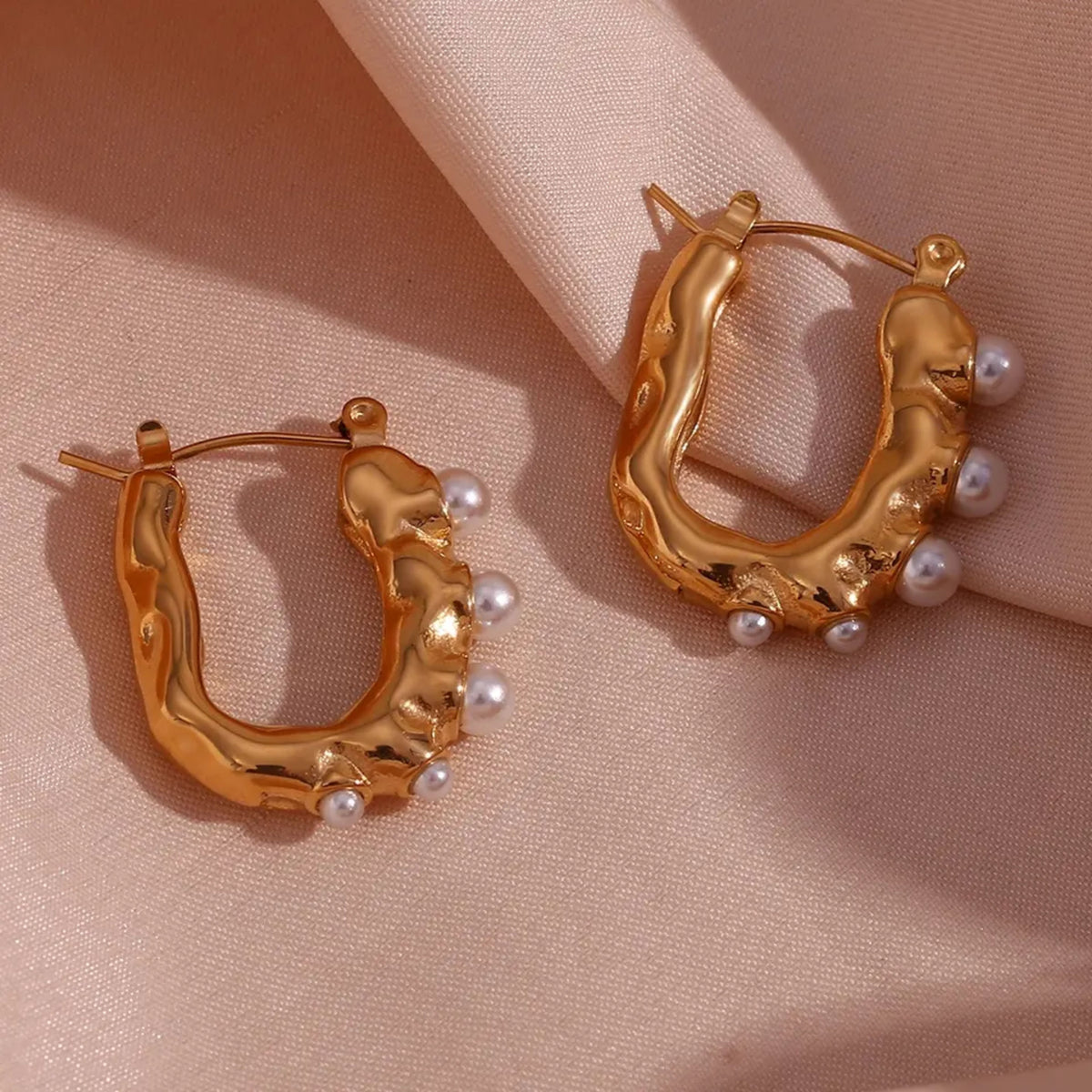 Embody raw elegance with Gaia Organic Pearl Hoops—gold plated, anti-tarnish, and crafted in a bold, molten-texture with scattered luminous pearls. Lightweight and distinctive, these statement hoops pair natural artistry with gleaming sophistication for evening and luxe everyday wear.