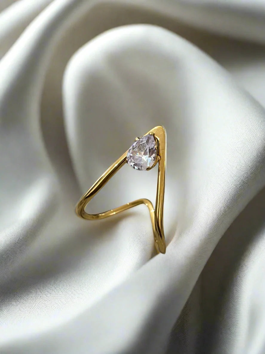 Make a sophisticated statement with the Vogue Veil Pear Gold Ring—featuring an elegant V-shaped gold band that wraps gracefully around a striking pear-cut center stone. Modern, lightweight, and artfully designed for everyday style or gifting, this ring adds an expressive touch to any look.