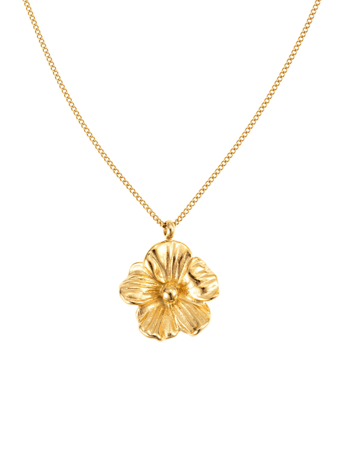 Celebrate radiant femininity with the Blossom Charm Gold Flower Necklace. Featuring a gorgeously sculpted, dimensional flower pendant, this piece brings a touch of nature-inspired elegance to your jewelry collection. The intricate, polished gold petals catch the light beautifully on a delicate chain—perfect for layering or making a subtle standalone statement. Ideal for gifting or treating yourself, this necklace effortlessly elevates both everyday looks and special occasions.