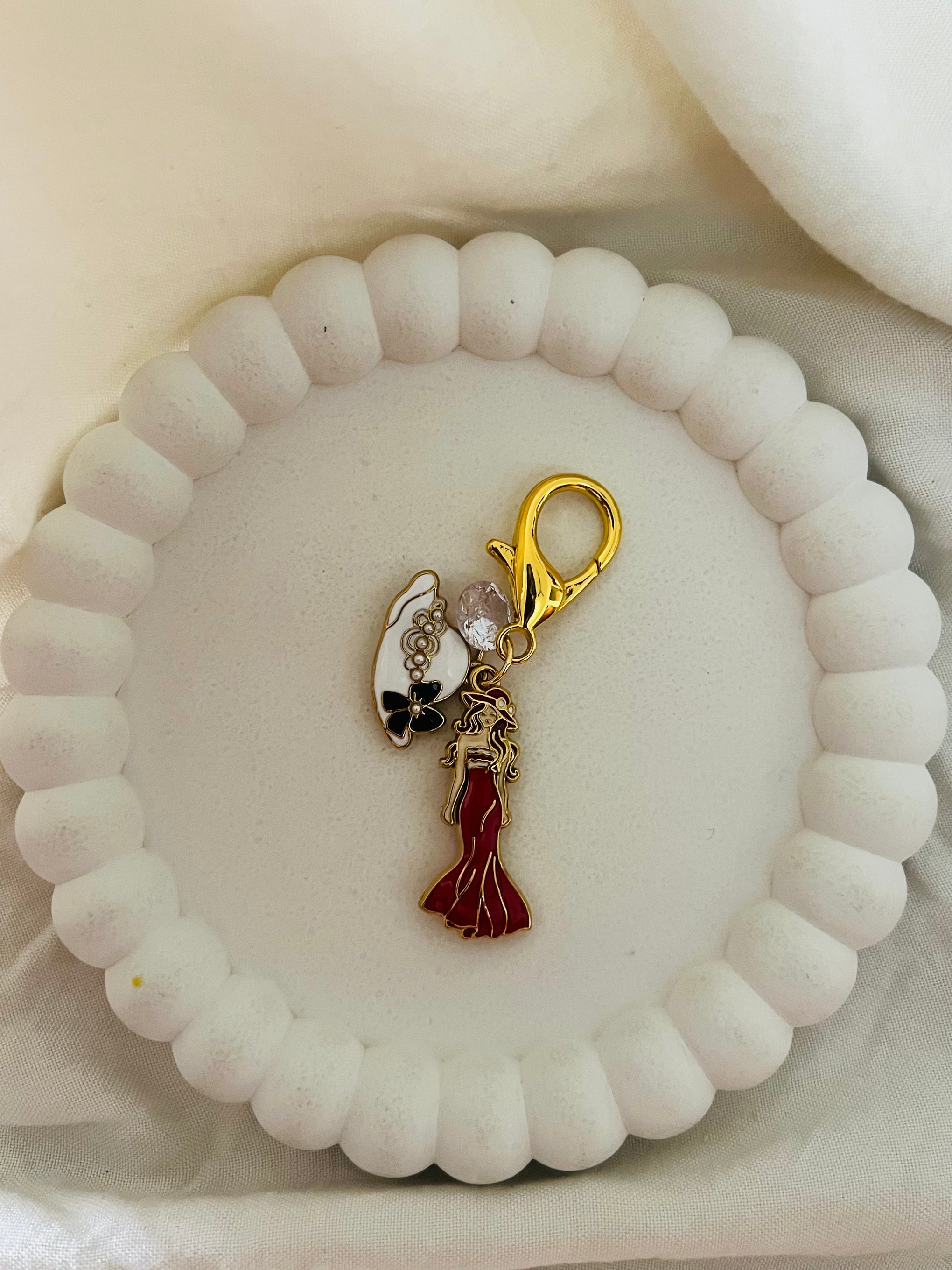 Embrace chic energy with the Glamour Night Red Dress Bag Charm. Featuring a stylish girl in a flowing red dress, butterfly-accented mirror, and sparkling crystal, this golden charm brings sophisticated drama to any bag. Hypoallergenic, durable, and perfect for everyday elegance or gifting.