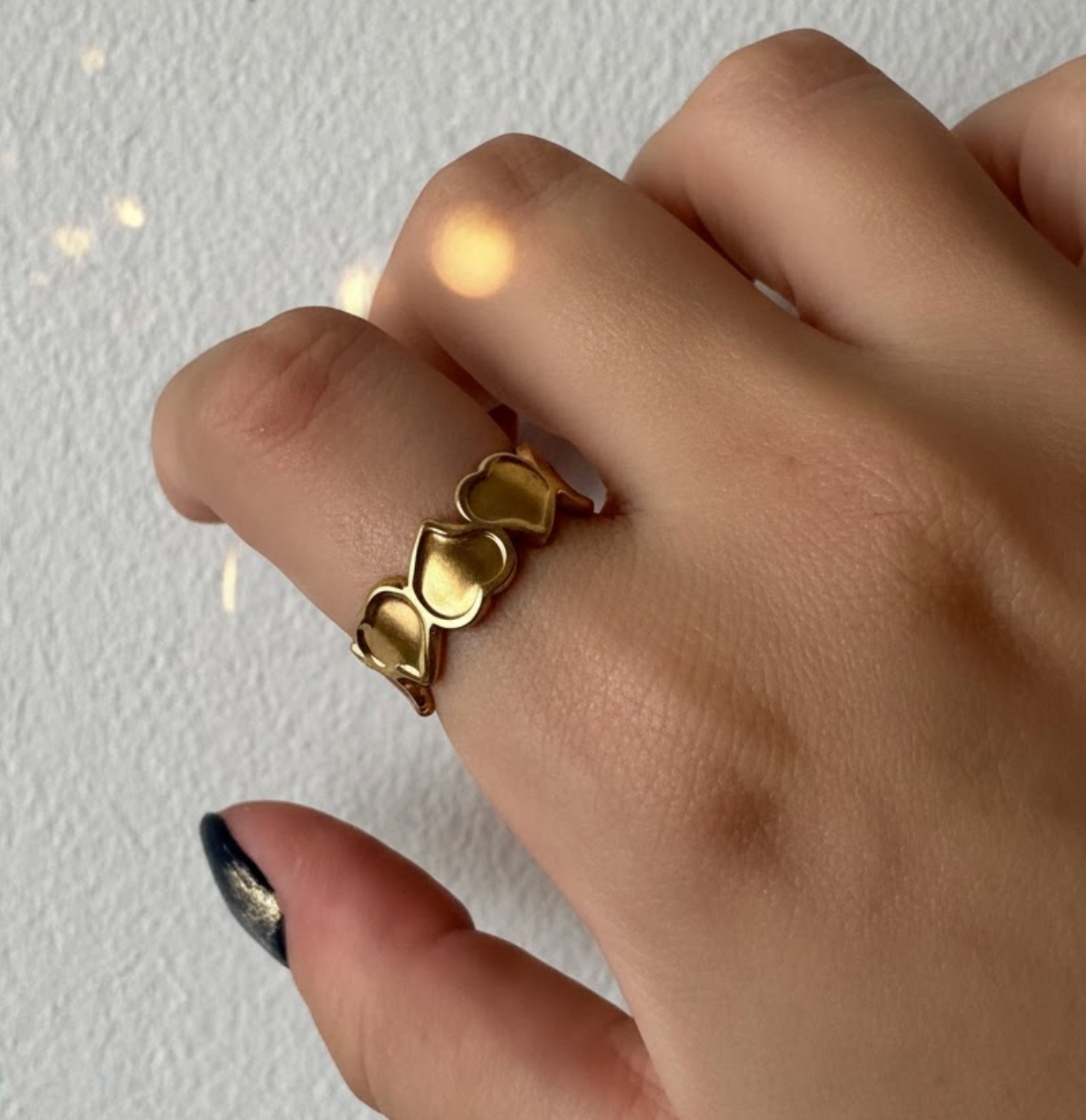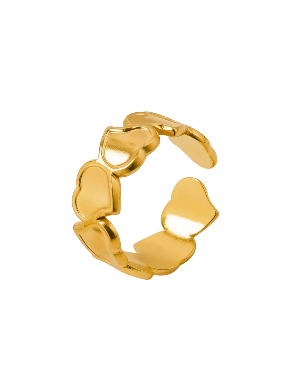 Spread love wherever you go with the Heart Stacks Adjustable Gold Ring. This charming open-band ring is crafted in luminous gold and adorned with sculptural heart motifs all around for a playful, romantic touch. The flexible, adjustable fit ensures every wearer enjoys comfort and style. Wear it solo to let your love shine, or stack it with your favorite rings for a dreamy look—perfect for daily wear or gifting to someone special.